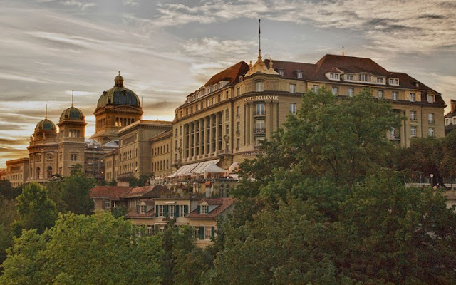 The vibrant hotel of the Swiss government with a history extending back 150 years ? The Bellevue Palace is the only grand hotel in the heart of the capital. The magnificed salons, the grandiose vista of the Bernese Alps and the warm hospitality make this luxury hotel so unique.In the La Terrasse restaurant , connoisseurs enjoy fine dining: great classic dishes reinvented by chef Gregor Zimmermann. The Bellevue Bar has always been a meeting place for politicians and diplomats, it featured in John le Carre's spy novels, and it is also a casual meeting place for a late night dinner for the whole of Berne.