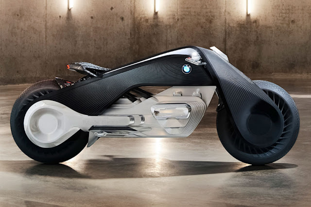 Then Vision Next 100 has the same iconic elements as BMW usual bikes like the black triangular frame, a classical form concerning twin cylinder but with no emission this time. The frame is particularly referring to first BMW bike: BMW R32 from 1923. But this time, there is no visible articulation even with a ?basic? look. The ergonomics have been rethought and the handlebars position reminds actual roadsters but with a new wind protection that reminds shrouds integral bikes. Looking towards future, Vision Next 100 presents black mat textile, with a BMW logo that illuminates the frame on routes, with the emblematic white and blue colors. Always concerning the design, there is a flexframe extending from front to rear wheel that can distort to allow the bike to change direction easily. So the pilot will have no difficulty to move his vehicle when it is stationary or to keep control at high speeds. Then, the powertrain emits no emission and t...