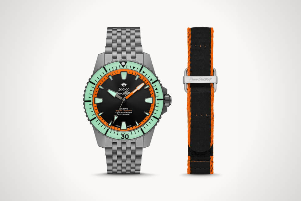 The Super Sea Wolf Pro Diver Titanium is paired to a seven-link titanium bracelet and Zodiac even throws in an extra fabric strap.